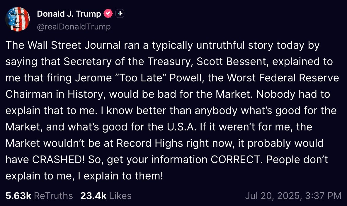 “The Wall Street Journal ran a typically untruthful story today by saying that Secretary of the Treasury, Scott Bessent, explained to me that firing Jerome “Too Late” Powell, the Worst Federal Reserve Chairman in History, would be bad for the Market. Nobody had to explain that to me. I know better than anybody what’s good for the Market, and what’s good for the U.S.A. If it weren’t for me, the Market wouldn’t be at Record Highs right now, it probably would have CRASHED! So, get your information CORRECT. People don’t explain to me, I explain to them!”