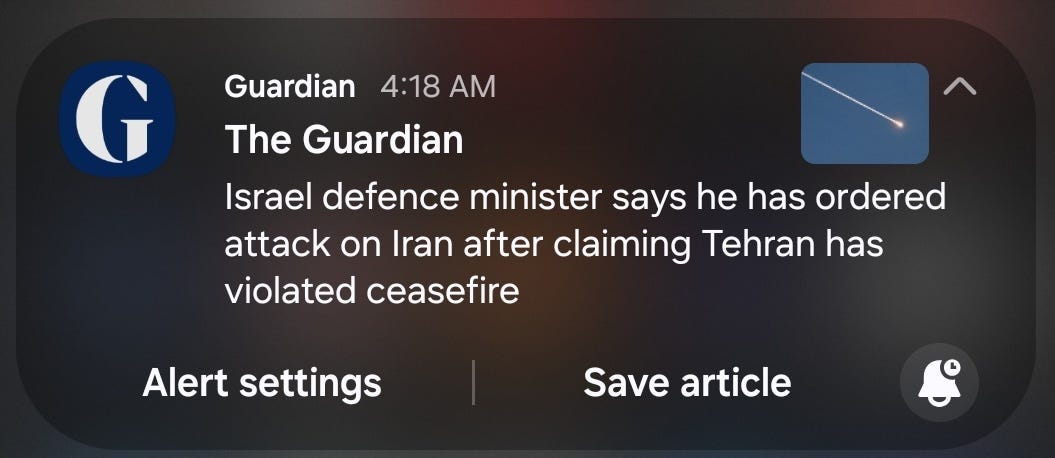 in fact, Israel was in the middle of raining down bombs on Tehran at the same time Donny was declaring that war was over and now everyone loves each other — and they, too, were all ‘what ceasefire?’