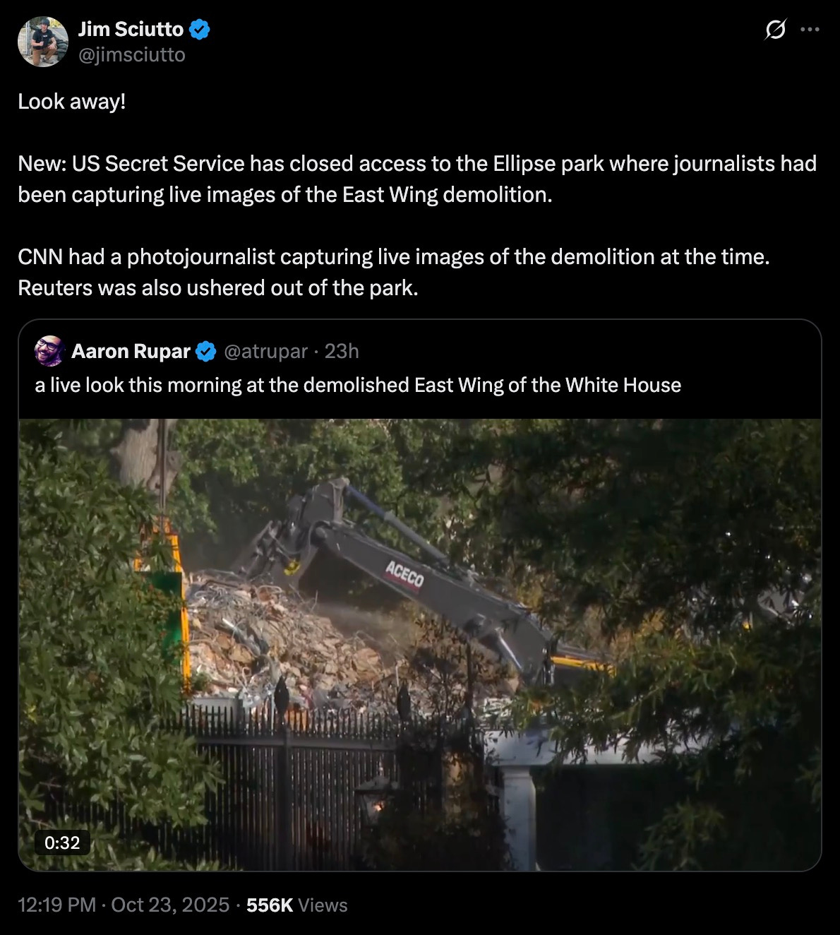 “Look away! New: US Secret Service has closed access to the Ellipse park where journalists had been capturing live images of the East Wing demolition. CNN had a photojournalist capturing live images of the demolition at the time. Reuters was also ushered out of the park.”