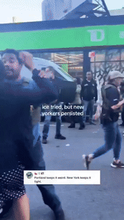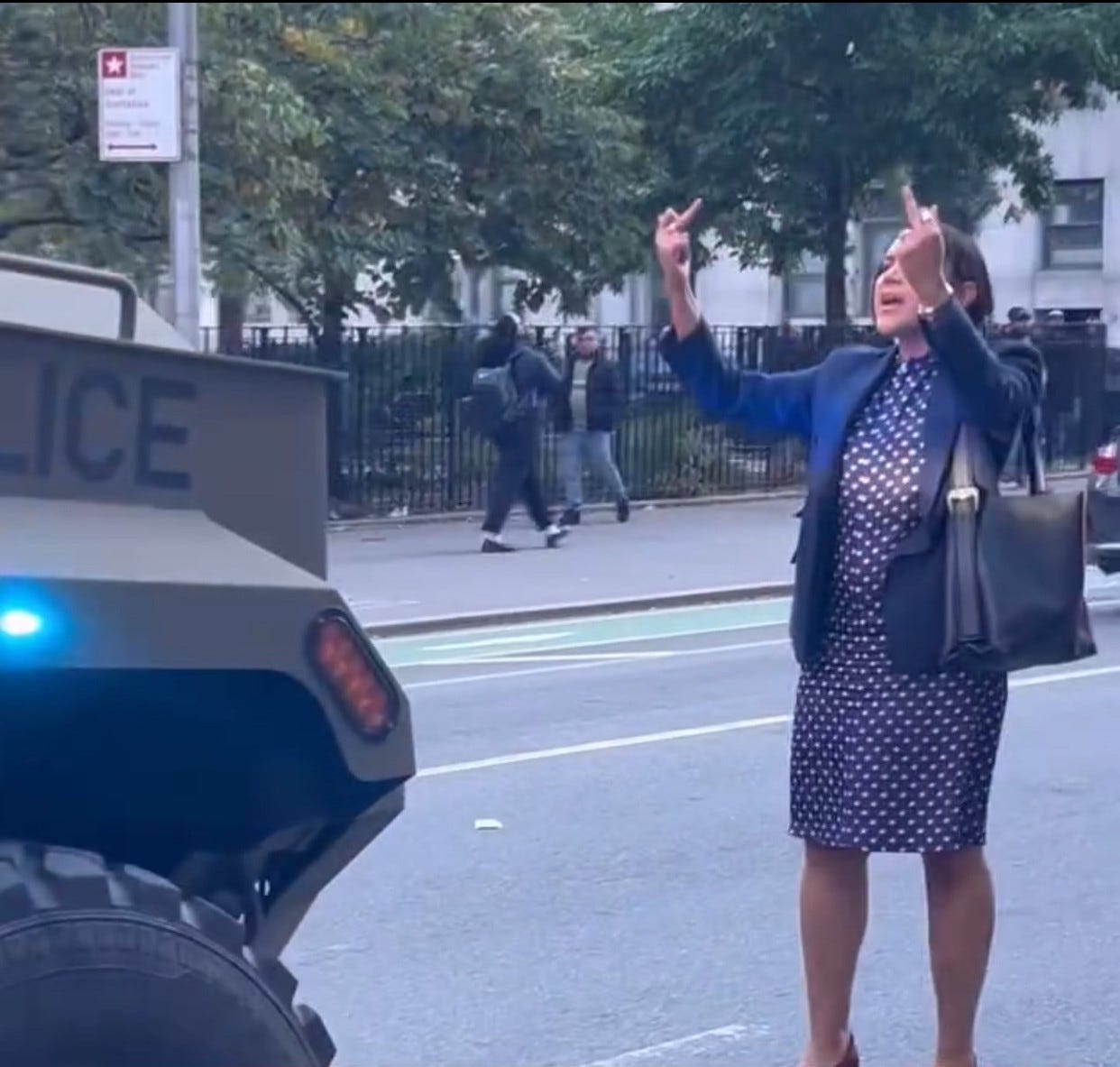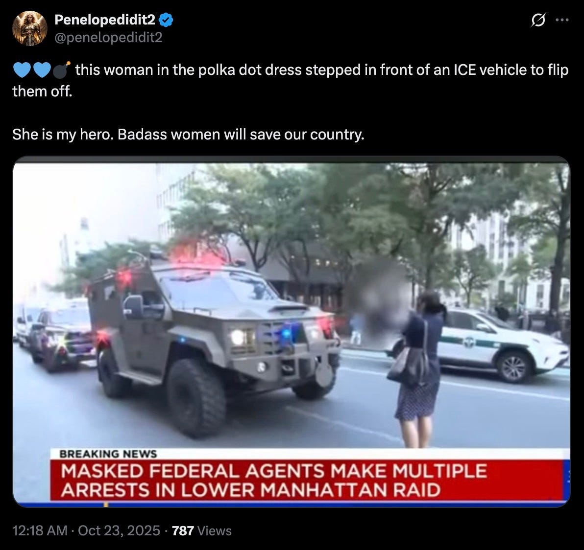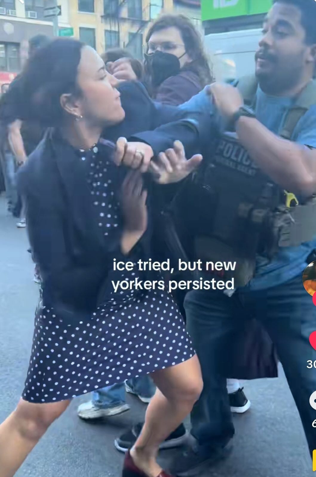 a couple of days ago, masked ICE thugs showed up in lower Manhattan to round up Chinese street vendors who were guilty of the dastardly crime of selling cheap knock-offs — and our anonymous hero was having none of it. apparently out for a lunch-hour stroll, she saw what was going on, and she was all this fuckery ends now.
