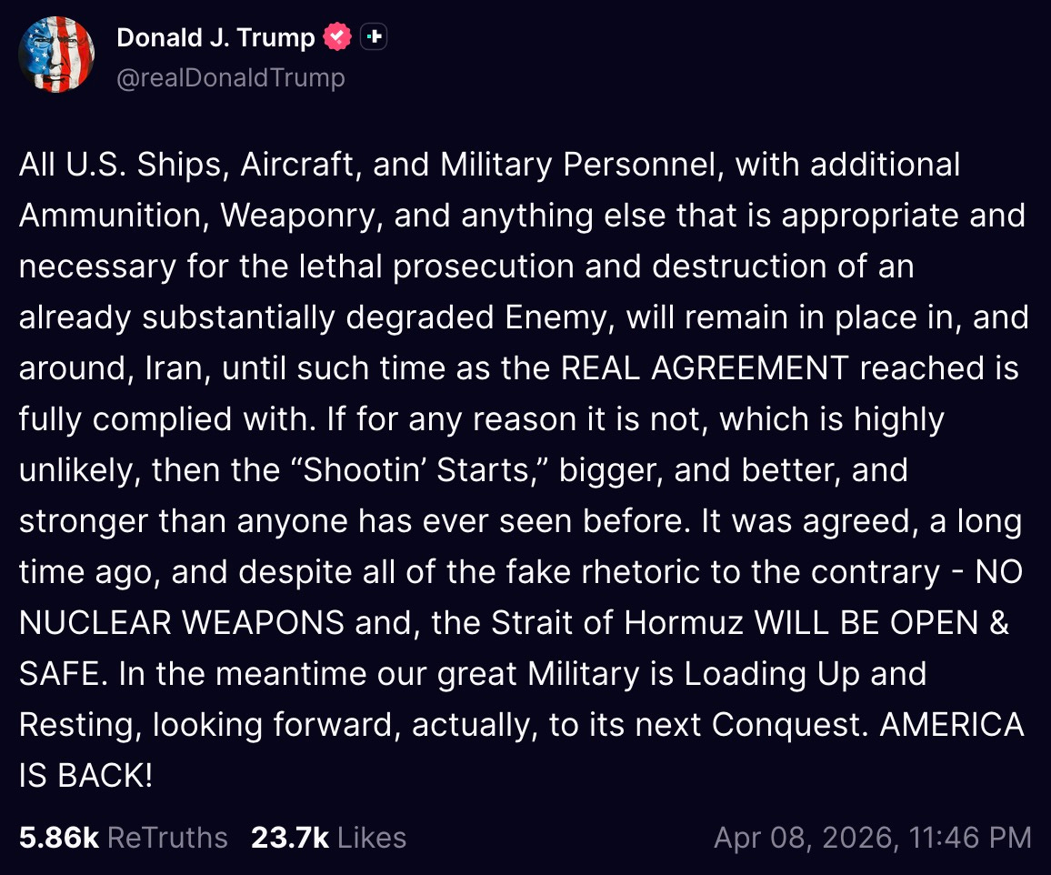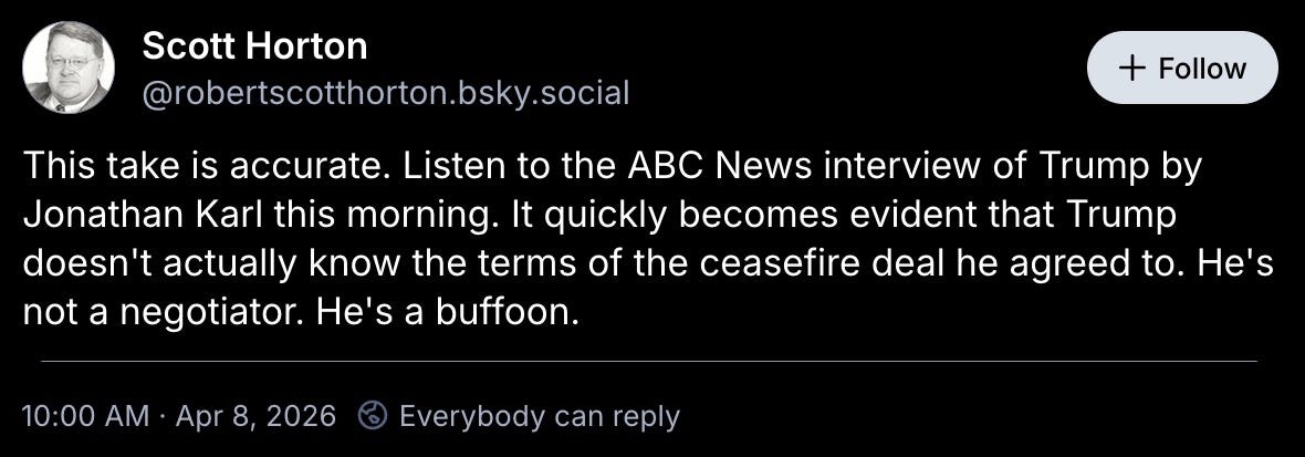 Donny Convict, it should go without saying, knows more about ceasefires than all the ceasefirers. therefore, it should come as no shock to learn that his ceasefire with Iran is a great ceasefire. it’s a ceasefire like few thought possible. it’s possibly the greatest ceasefire of all time.