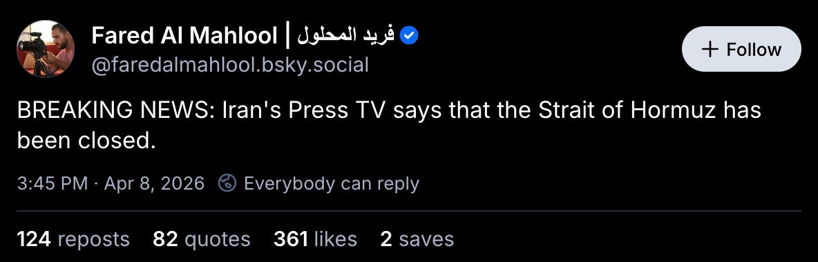 “BREAKING NEWS: Iran’s Press TV says that the Strait of Hormuz has been closed.”