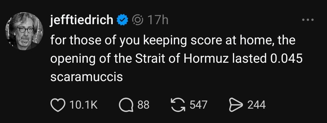 “for those of you keeping score at home, the opening of the Strait of Hormuz lasted 0.045 scaramuccis.”