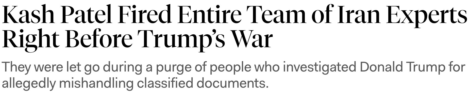 Kash Patel baselessly fired an elite team of agents specializing in foreign threats from the Middle East just days before Donald Trump launched an illegal military campaign in Iran.