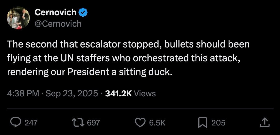 “The second that escalator stopped, bullets should been flying at the UN staffers who orchestrated this attack, rendering our President a sitting duck.”