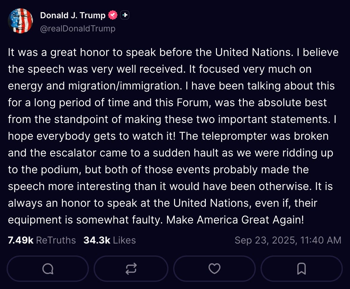 “all I got from the United Nations was an escalator that on the way up stopped right in the middle. if the first lady wasn’t in great shape, she would have fallen. but she’s in great shape. we’re both in good shape, we both stood— and then a teleprompter that didn’t work. this is, these are the two things I got from the United Nations, a bad escalator and a bad teleprompter. thank you very much.”