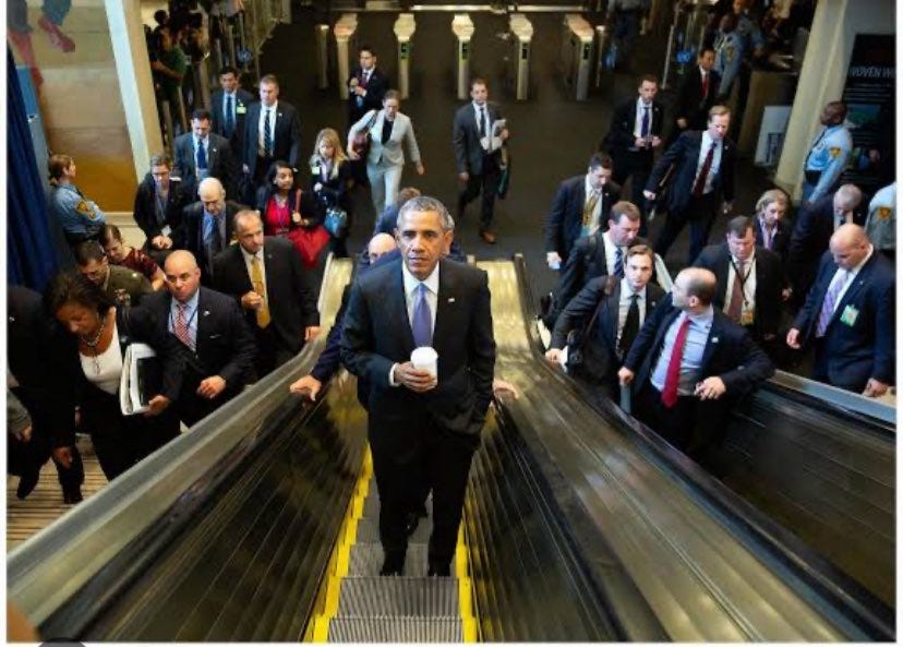 oh my god, Mister President, what a harrowing experience, to be halfway up a crowded escalator, only to have it violently lurch to a sudden stop, throwing everyone off balance and threatening your very life.