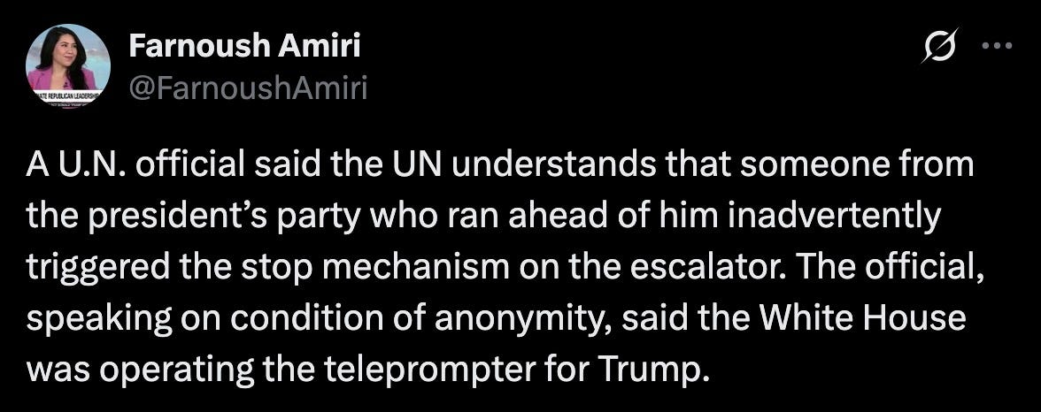 “A U.N. official said the UN understands that someone from the president’s party who ran ahead of him inadvertently triggered the stop mechanism on the escalator. The official, speaking on condition of anonymity, said the White House was operating the teleprompter for Trump.”