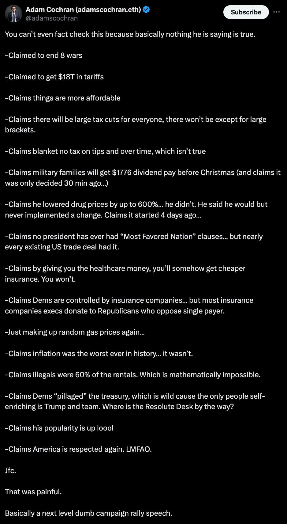 everything — and I mean everything — that came out of Donny’s rancid anus-mouth last night was a lie. he once again claimed to have ended eight wars. he hasn’t. he claimed tariffs have already brought eighteen trillion dollars into the US. they haven’t. he claimed things are already more affordable. ha fucking ha. he claimed everyone’s getting a tax cut. has he even read his own Big Stupid Bill?