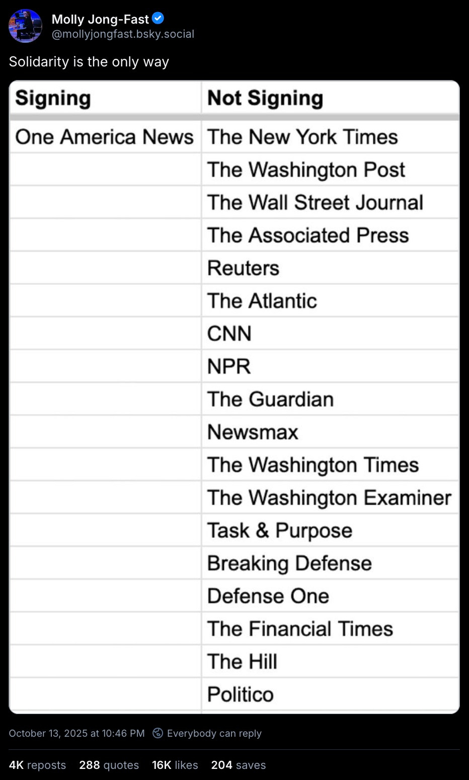 but not in this case. after being commanded to become complicit military propagandists, almost every major news outlet has cordially invited the Pentagon to go fuck itself.