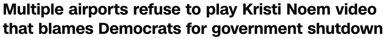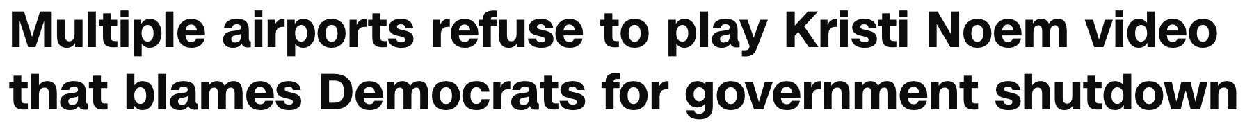 Several major US airports - including Las Vegas’ Harry Reid International, Portland International, Seattle-Tacoma International, Charlotte Douglas International Airport and three in New York - are refusing to play a video of Secretary of Homeland Security Kristi Noem in which she blames Democrats for the federal government shutdown.