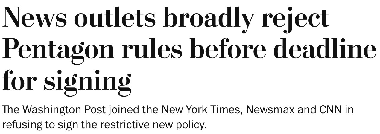 remember that clownfuckery he pulled a couple of weeks ago, where he decreed that all reporters covering the Pentagon had to sign a pledge agreeing to stop doing any actual reporting, and only print what the Department of Defense had approved in advance?