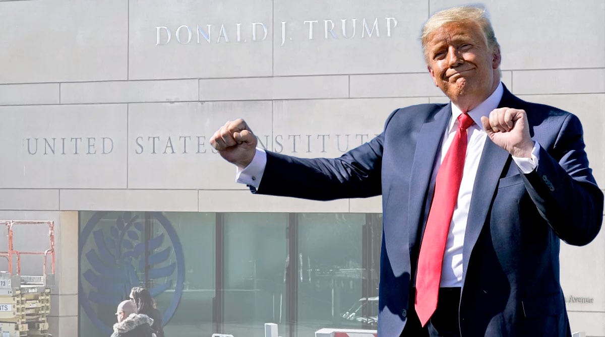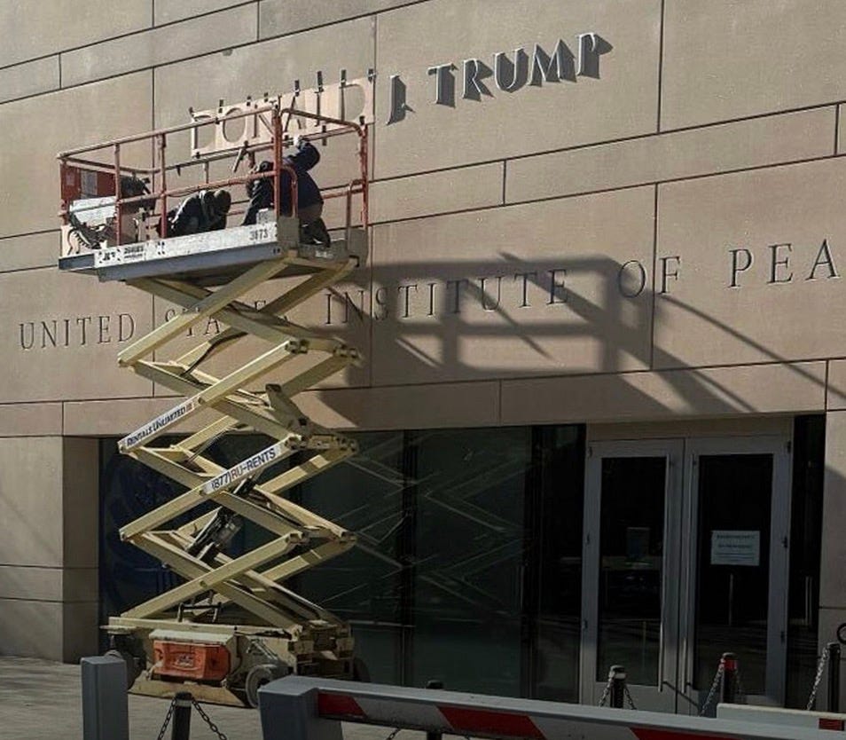 on Wednesday, out of the clear blue, workers showed up at the US Institute of Peace building in Washington DC, and slapped Donny Convict’s name on it.