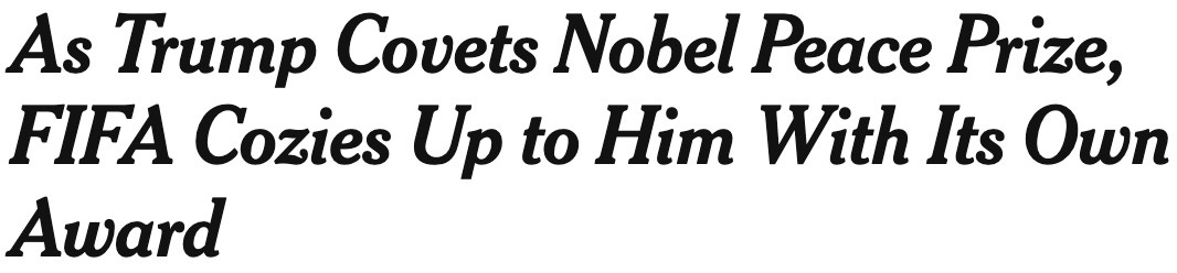 Mr. Infantino, president of FIFA, soccer’s global governing body, who had publicly lobbied for Mr. Trump to receive the peace prize, simply had his organization establish its own. The announcement of the “FIFA Peace Prize — Football Unites the World” was so hastily arranged that it surprised several of the body’s most senior officials, including board members and vice presidents, according to four soccer executives briefed on the events.