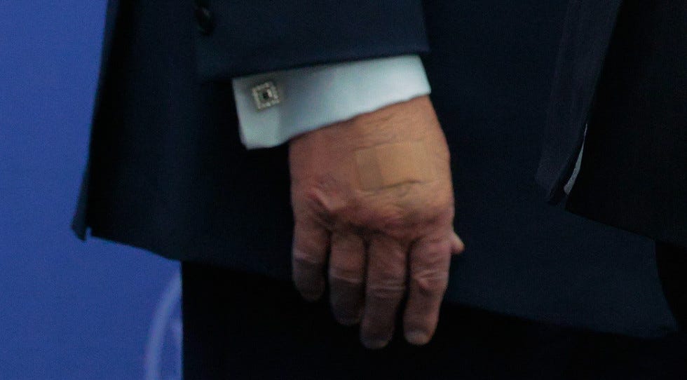 yeesh. oh my god. look at that bloated, decaying thing, like the hand of a corpse that was just pulled out of a polluted lake. and now Donny’s wearing what looks like two band-aids. concealing what, pray tell?