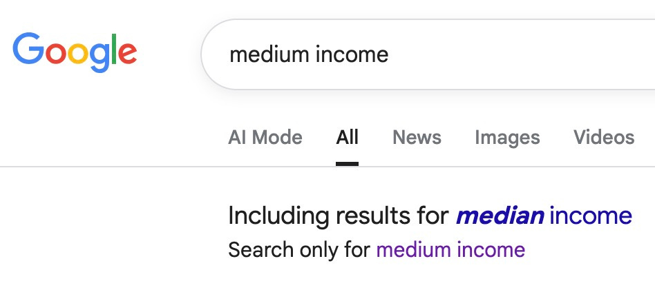 you can’t even google ‘medium income.’ when I tried, google assumed I had meant to type median, and displayed results for that.