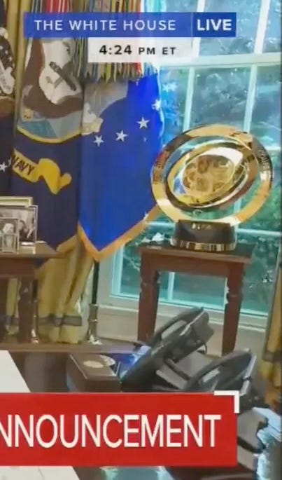 and if keeping Donny happy includes letting him steal whatever he can get his greasy hands on, well, so be that, too. in that video clip at the top of this post, did you notice what Donny now proudly displays behind his desk?