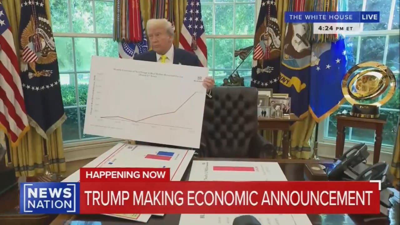 During an impromptu news conference, the president displayed charts from Stephen Moore, an economist at the conservative Heritage Foundation, that he said proved his economy was better than that of his predecessor, President Joseph R. Biden Jr.