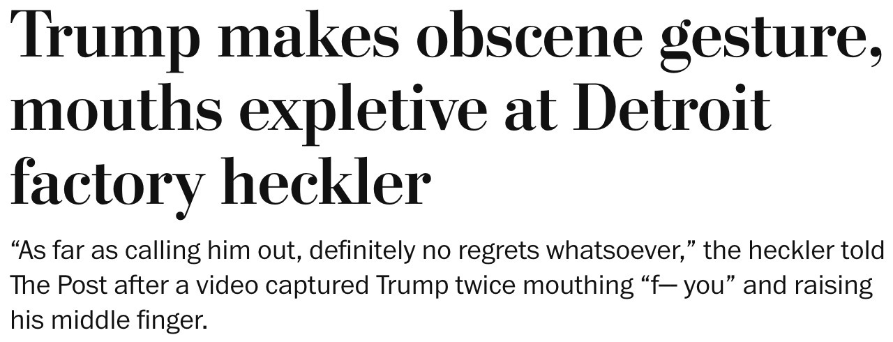 Trump makes obscene gesture, mouths expletive at Detroit factory heckler