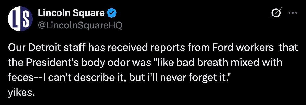“Our Detroit staff has received reports from Ford workers that the President’s body odor was ‘like bad breath mixed with feces — I can’t describe it, but I’ll never forget it.’ yikes.”