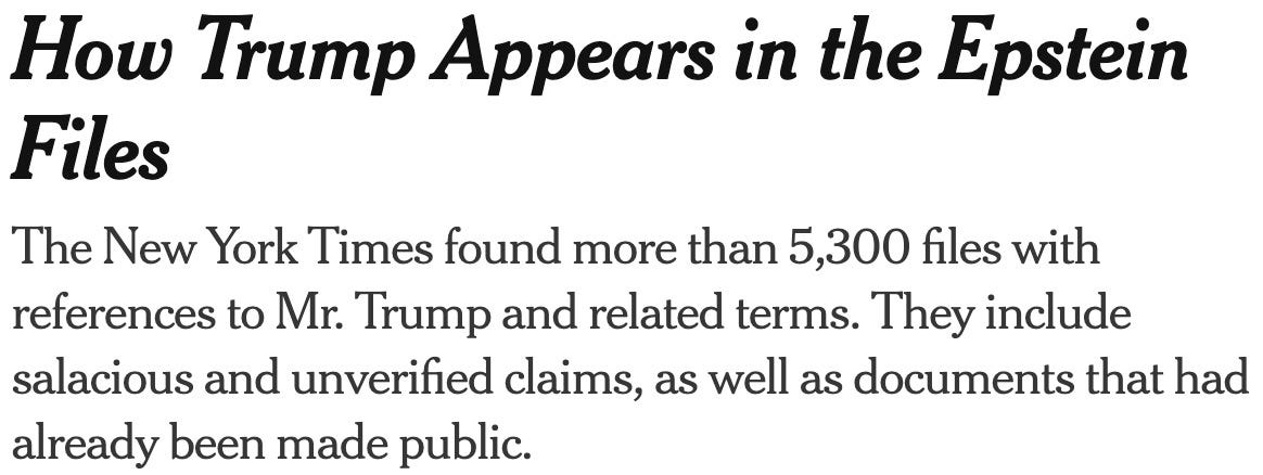 the New York Times actually committed a journalism, and counted up the number of times Donny’s mentioned in the Epstein files that have been released so far. their tally? more than 5,300. and here’s a fun fact: that’s more than five times the number of mentions of Jesus in the Bible.