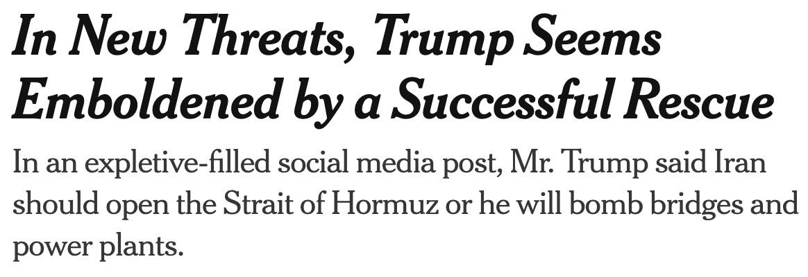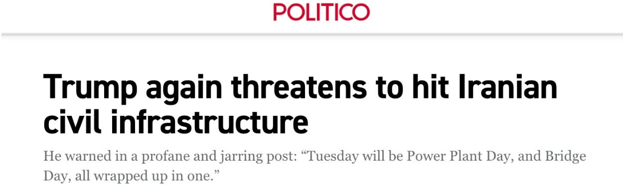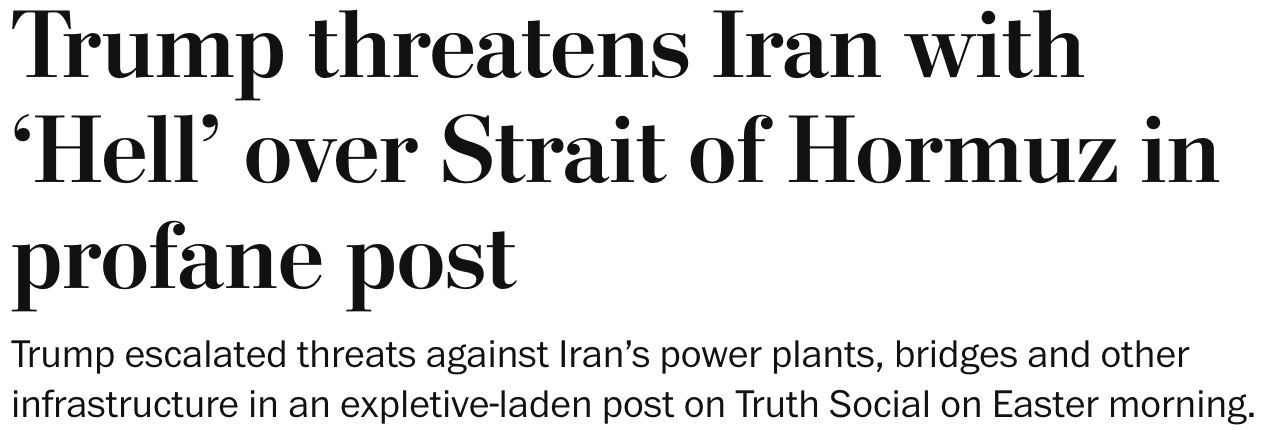 “if your children are watching, be warned — the president did not use polite language. quote: ‘Tuesday will be power plant day, and bridge day, all wrapped up in one, in Iran. there will be nothing like it! open the fuckin’ Strait, you crazy bastards, or you’ll be living in Hell — just watch!’”