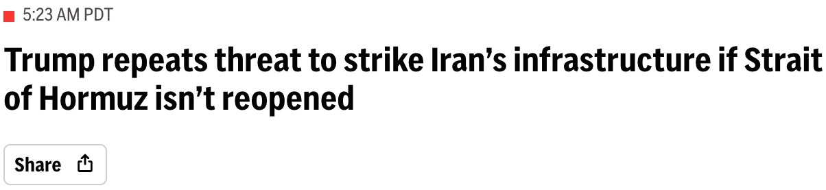 tell me, somebody, why does Donny need to be threatening Iran to open the fuckin’ Strait in the first place?