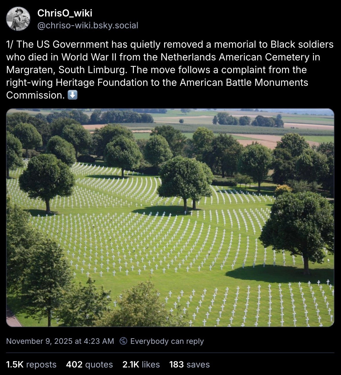 what in the actual fuck? the Heritage Foundation was so outraged that Black soldiers — who gave up their lives defending their country — were being honored in a cemetery in The Netherlands that they pressured the American Battle Monuments Commission to shitcan the whole thing.