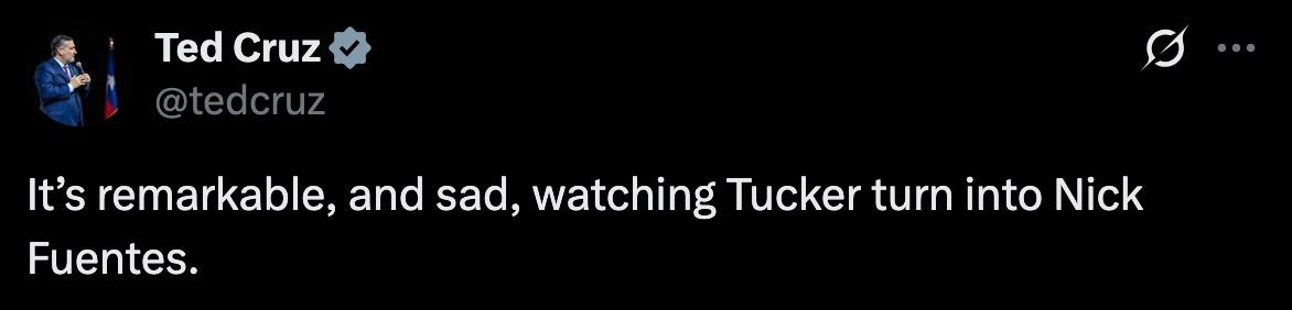 this whole current meltdown started when frozen-fish-stick heir and roasted ballsack aficionado Tucker Swanson McNear Carlson invited Nazi fuckstick Nick Fuentes onto his podcast to whitesupremacist it up for two and a half hours.