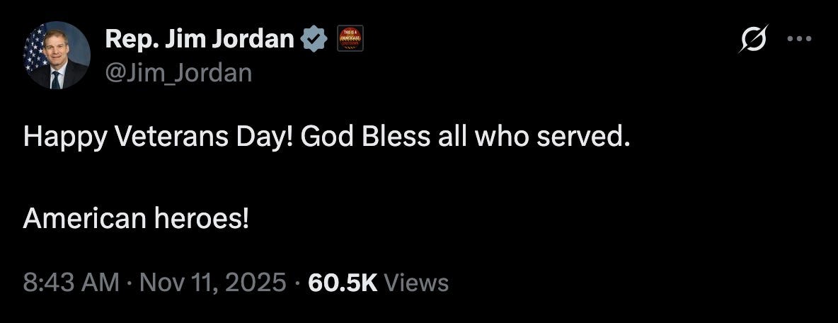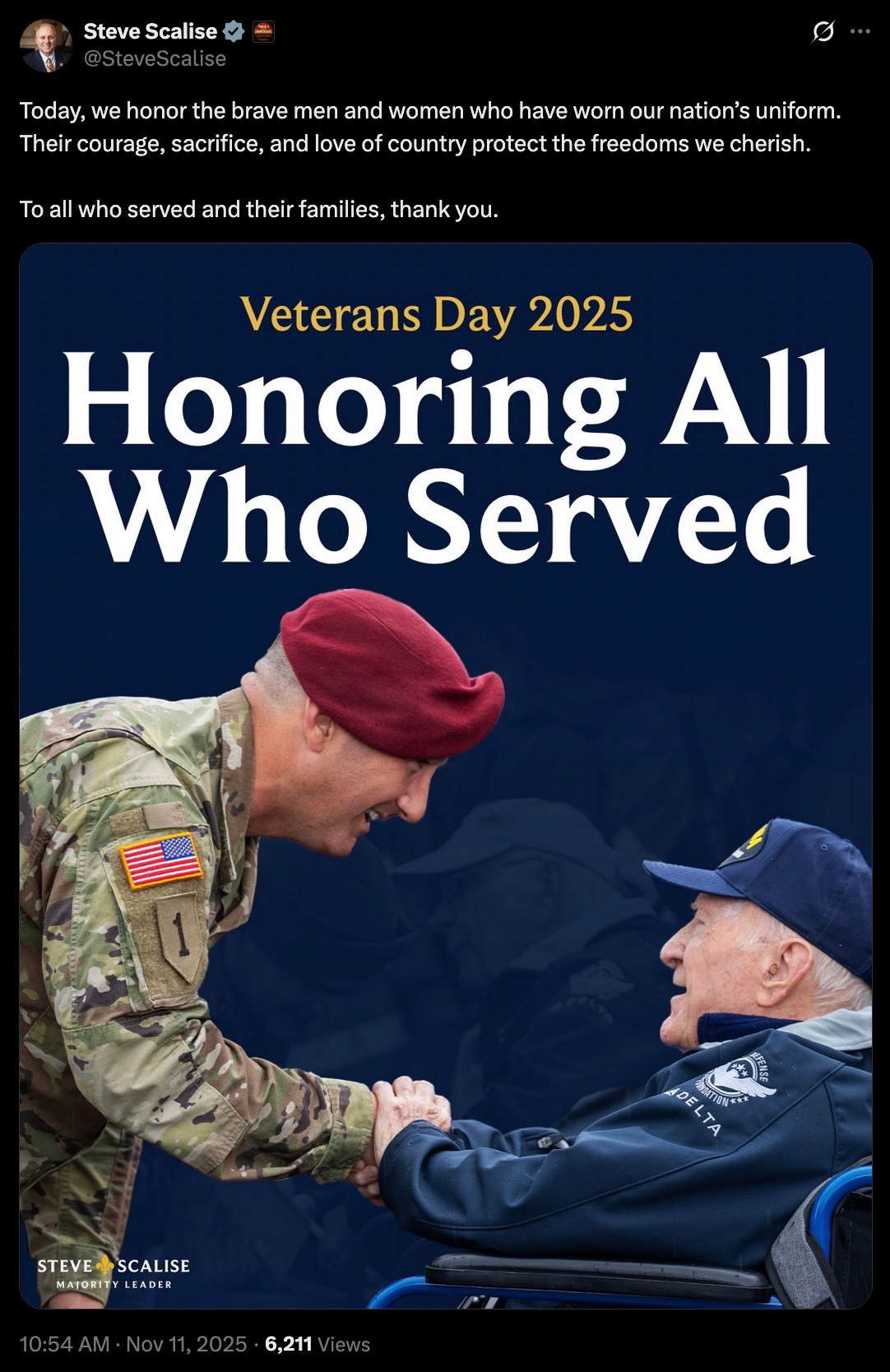 “Today, we honor the brave men and women who have worn our nation’s uniform. Their courage, sacrifice, and love of country protect the freedoms we cherish. To all who served and their families, thank you.”