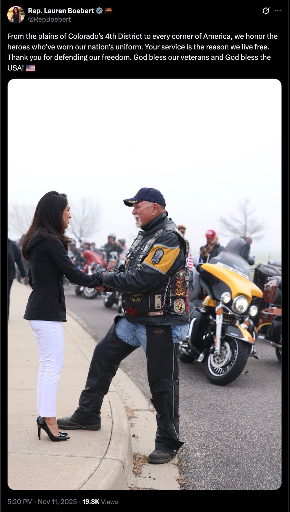 “From the plains of Colorado’s 4th District to every corner of America, we honor the heroes who’ve worn our nation’s uniform. Your service is the reason we live free. Thank you for defending our freedom. God bless our veterans and God bless the USA!”