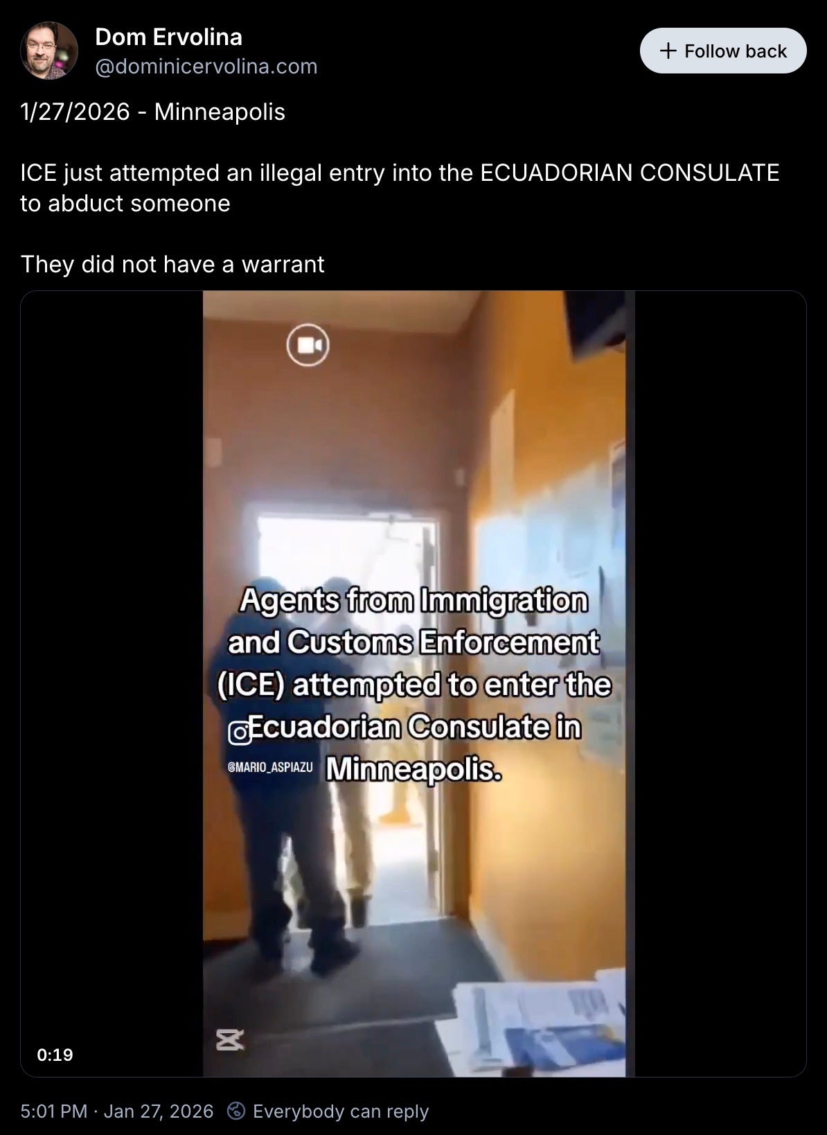 “1/27/2026 - Minneapolis - ICE just attempted an illegal entry into the ECUADORIAN CONSULATE to abduct someone. They did not have a warrant.”