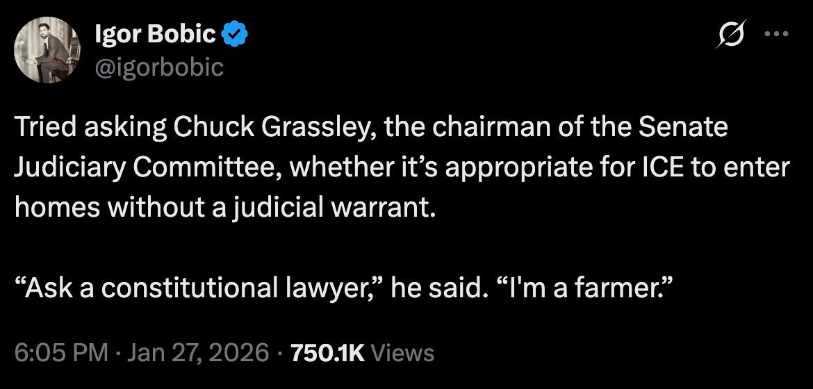 “Tried asking Chuck Grassley, the chairman of the Senate Judiciary Committee, whether it’s appropriate for ICE to enter homes without a judicial warrant. ‘Ask a constitutional lawyer,” he said. ‘I’m a farmer.’”