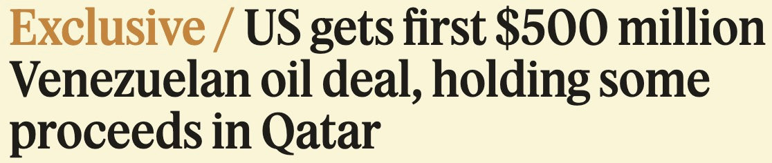 okay, so Donny sold off the oil he stole from Venezuela for a cool half-billion dollars, and stuck it in a bank account that he controls — in fucking Qatar? the county that gifted Donny a vulgar flying bordello? the one where Donny’s building another fugly golden tower?