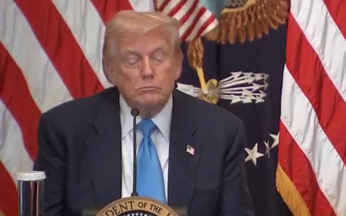 returning to the White House after five days spent cheating at his failing Scotland golf motel, Sundowning Grandpa Befuddlepants got right back to work — by which I mean that the narcoleptic old fart factory fell fast asleep in public. again.