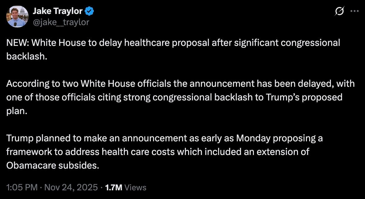 “I’m sorry, this has actually been— sorry, we’re getting breaking news while I’m talking to you, I have learned that the White House has postponed its expected unveiling of a new healthcare proposal.”