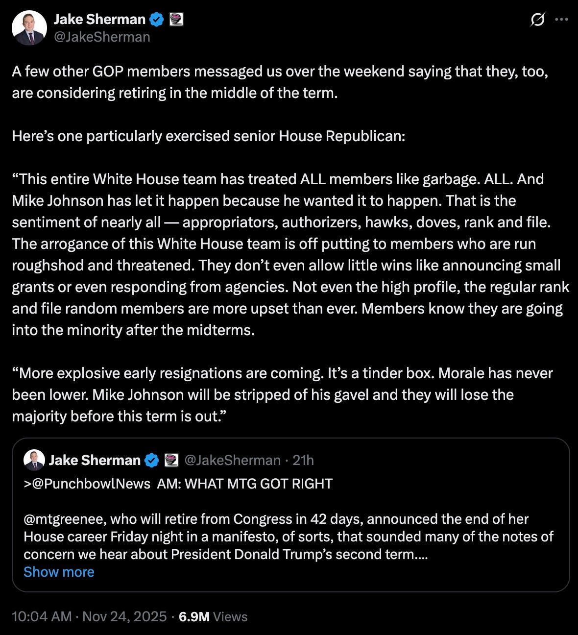 “More explosive early resignations are coming. It’s a tinder box. Morale has never been lower. Mike Johnson will be stripped of his gavel and they will lose the majority before this term is out.”
