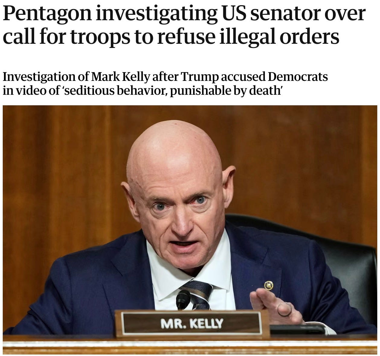 In a statement on Monday on social media announcing the investigation into Senator Mark Kelly, a veteran, the Pentagon cited a federal law that allows retired service members to be recalled to active duty on orders of the defense secretary for possible court martial or other measures. Kelly served in the US navy as a fighter pilot before going on to become an astronaut. He retired at the rank of captain.