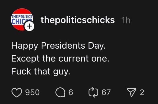 and, finally, Happy Presidents’ Day. except the current one. fuck that guy.