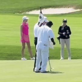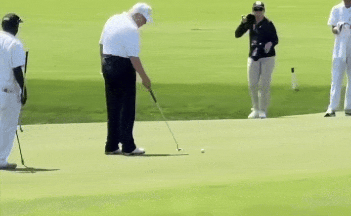 Donny’s caddie takes a golf ball out of a bag and drops it on the green, after which Donny pushes the ball with his club, and then drags it back towards him.