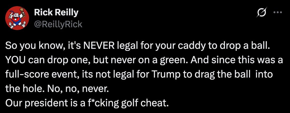 the cheating cheater who cheated to get into college and cheated to get out of Vietnam and cheated on his wives and cheated on his taxes and cheated students at his scam university and cheated donors to his fake charity just got caught cheating at golf for the second weekend in a row.