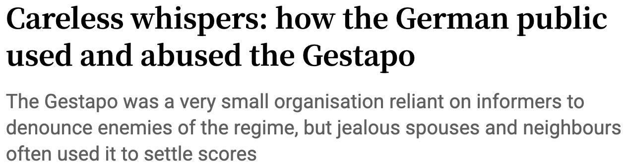the Nazi were huge on using the public as spies — and you’ll be shocked to learn that ordinary Germans ended up informing on their innocent neighbors out of spite and jealousy, and for personal gain.