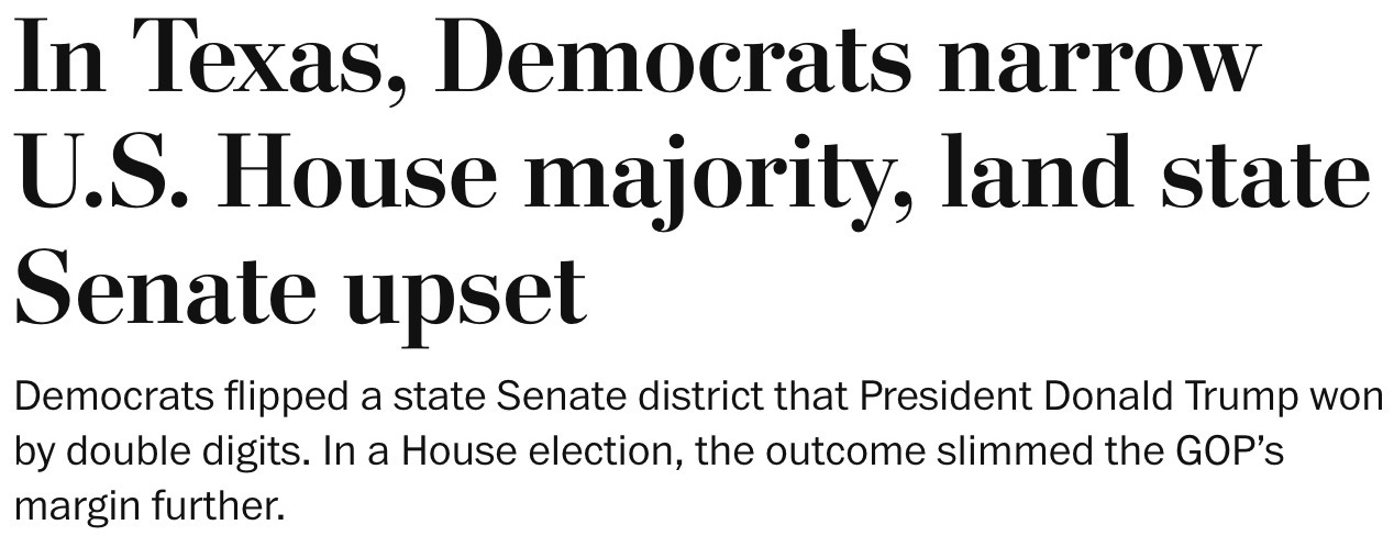 that’s how pissed off Americans are right now at Donny and his enablers in the GOP — even Texans are voting Republicans out of office.