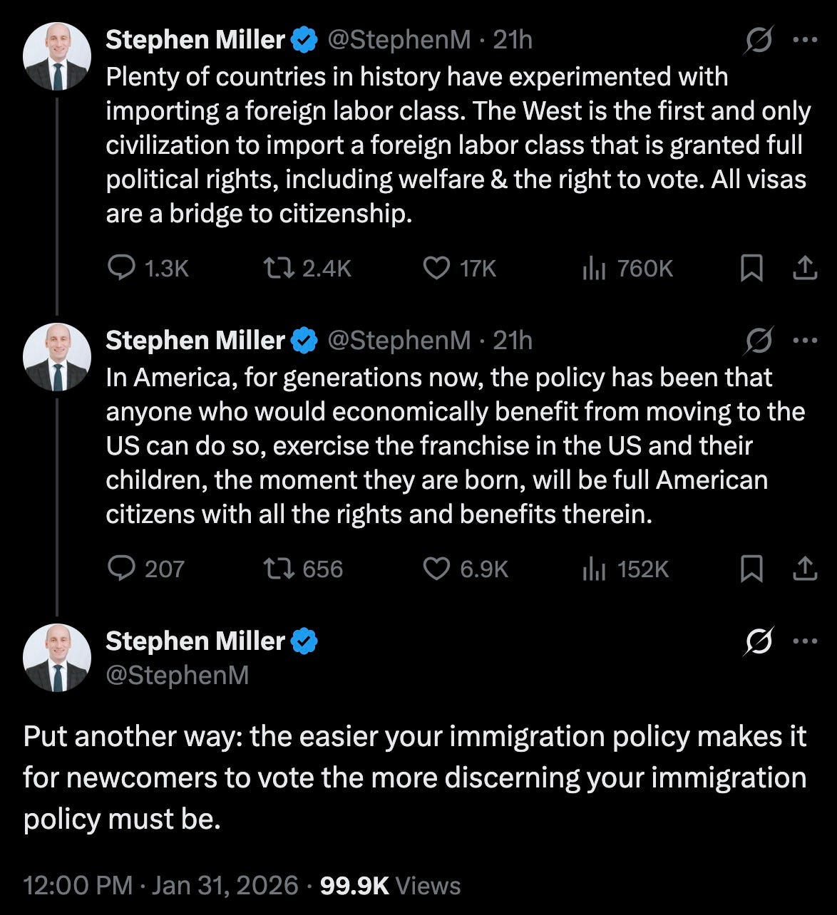 what Stephen Miller envisions here a second class of Americans — a ‘foreign labor class’ — who could live here and work here, but who would forever be excluded from enjoying the ‘rights and benefits’ of citizenship.