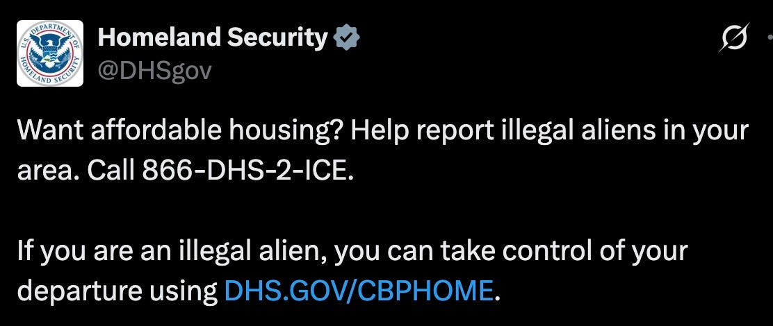 “Want affordable housing? Help report illegal aliens in your area. Call 866-DHS-2-ICE.”