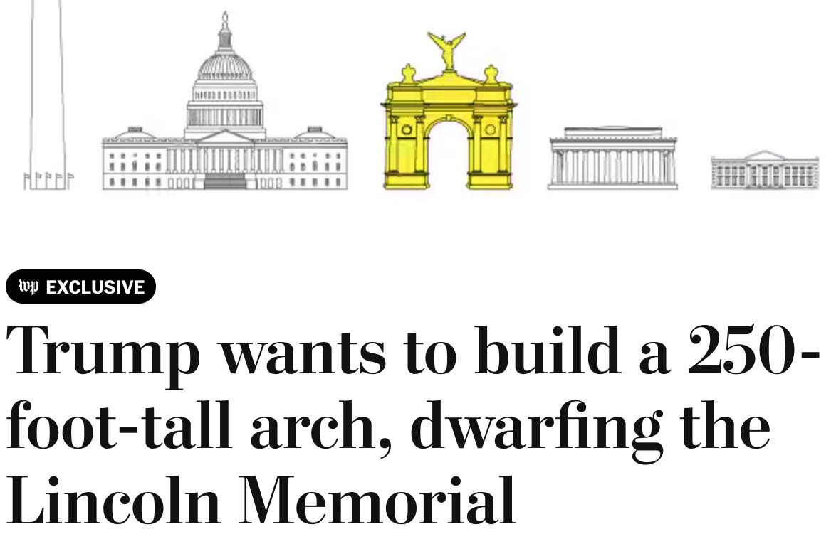 here’s some more Third-Reich-level batshittery. that ginormous arch that Donny wants to inflict in the middle of Washington DC just keeps getting ginormouser. now the fucking thing is going to be as tall as the Capitol Building.