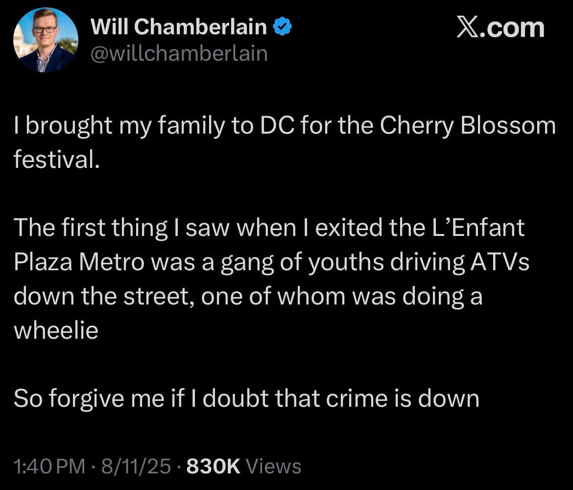 “I brought my family to DC for the Cherry Blossom festival. The first thing I saw when I exited the L’Enfant Plaza Metro was a gang of youths driving ATVs down the street, one of whom was doing a wheelie So forgive me if I doubt that crime is down.”