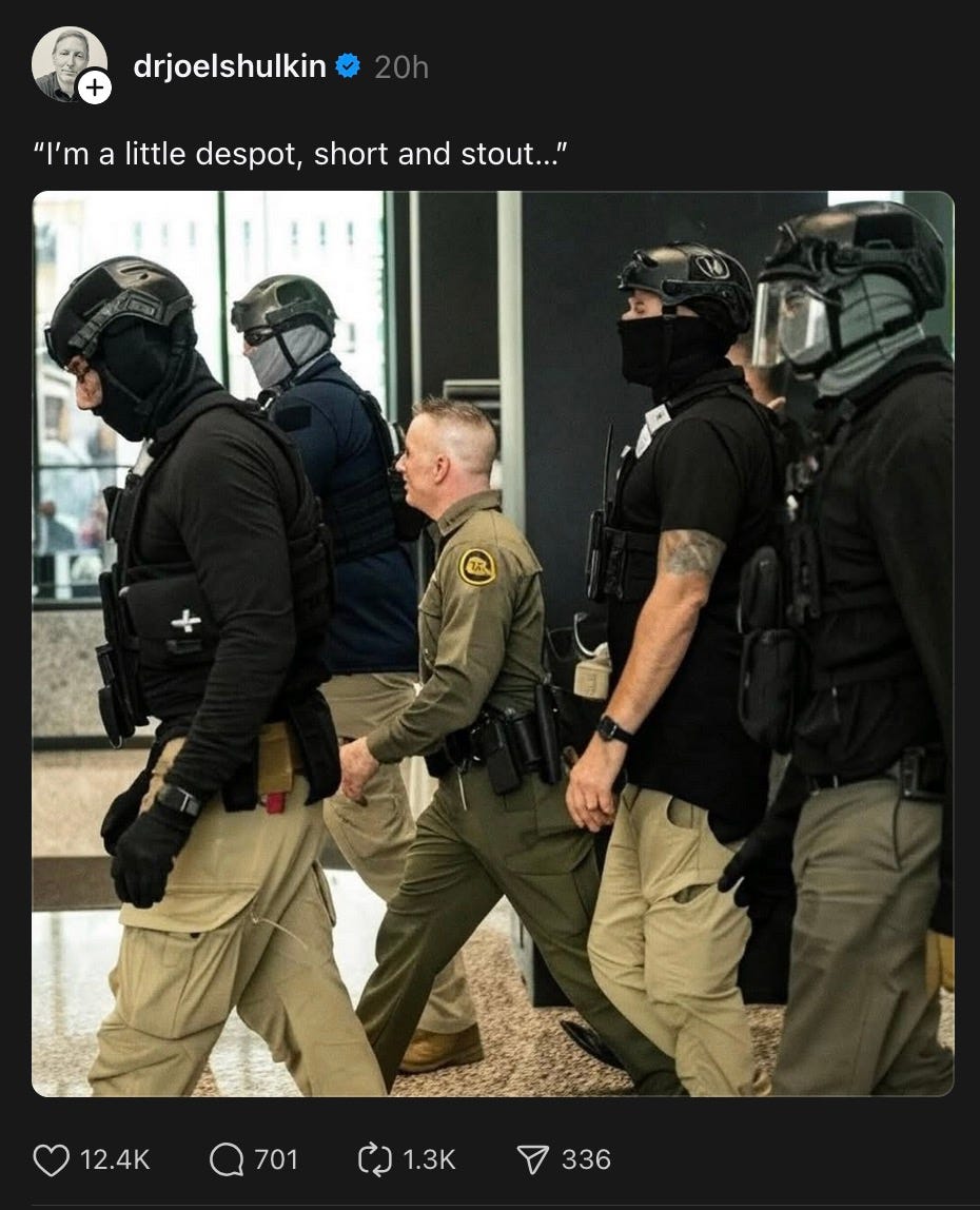 as Jesus so wisely counseled us in his Sermon on the Mount, ‘blessed are the meme creators, for they shall win the internet’ — so without further ado, I give you today’s winner of all the internets: Dr. Joel Shulkin, who posted ‘I’m a little despot, short and stout…’