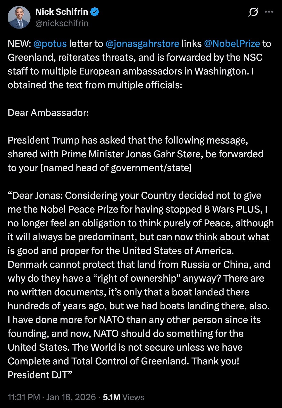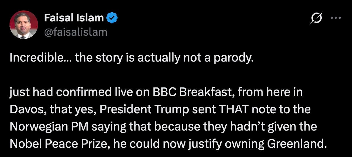 Faisal Islam: “I hope you’re sitting comfortably. I know normally you talk to me about economics and numbers, but this is also the place where all these people will meet. Donald Trump is coming here on Wednesday. we think [UK Prime Minister] Kier Starmer might, too. he might want to get his skates on, because of something that’s just happened. uh, we have both the Norwegian prime minister and Finnish prime minister’s accounts of an exchange of letters which is truly extraordinary. it is absurd and funny in a way, but it’s also incredibly serious. overnight, an email, an exchange between those two and Donald Trump — and Donald Trump is reported to have replied, ‘considering your country,’ is the message to Norway, ‘decided not to give me the Nobel Peace Prize for having stopped the wars, I no longer feel an obligation to think purely of peace,’ and then goes on to make an argument for why America should own Greenland. an astonishing note, really, to think that would be sent by the president of the United States.”
