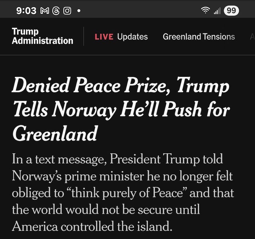 so there you are, in bed, staring at your phone in the dark at 4 o’clock in the morning, at a post claiming that Preznit Fuckwit says he has the right to invade Greenland because he didn’t get the Nobel Peace Prize — and all you can think is ‘this can’t possibly be real. someone photoshopped this.’